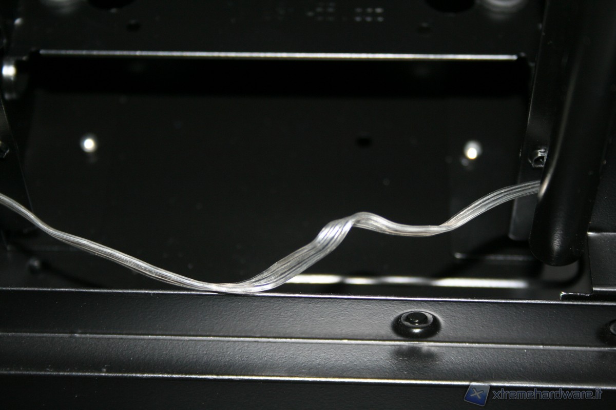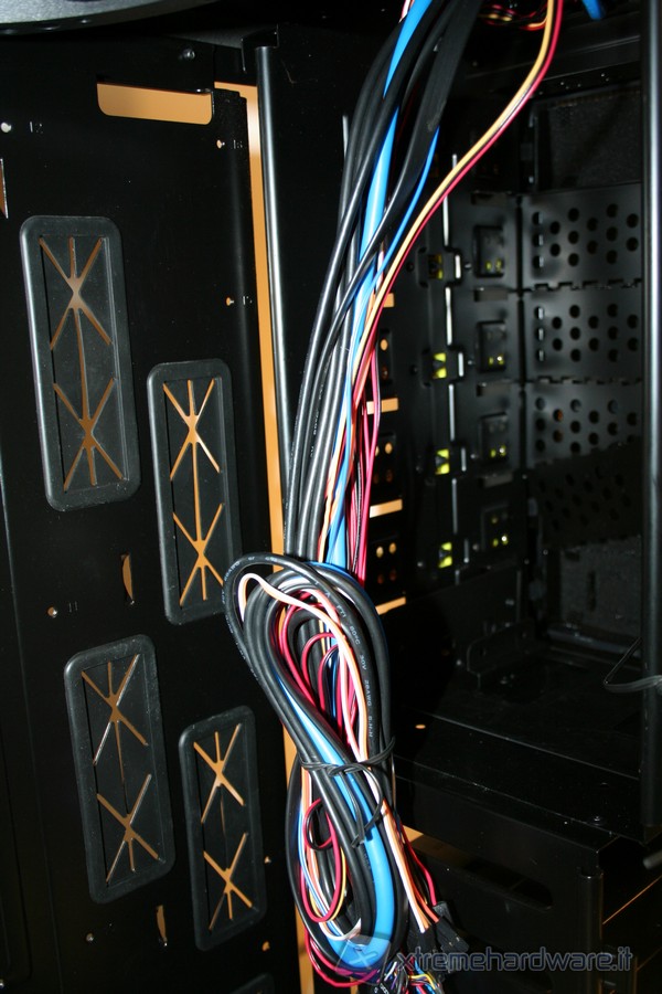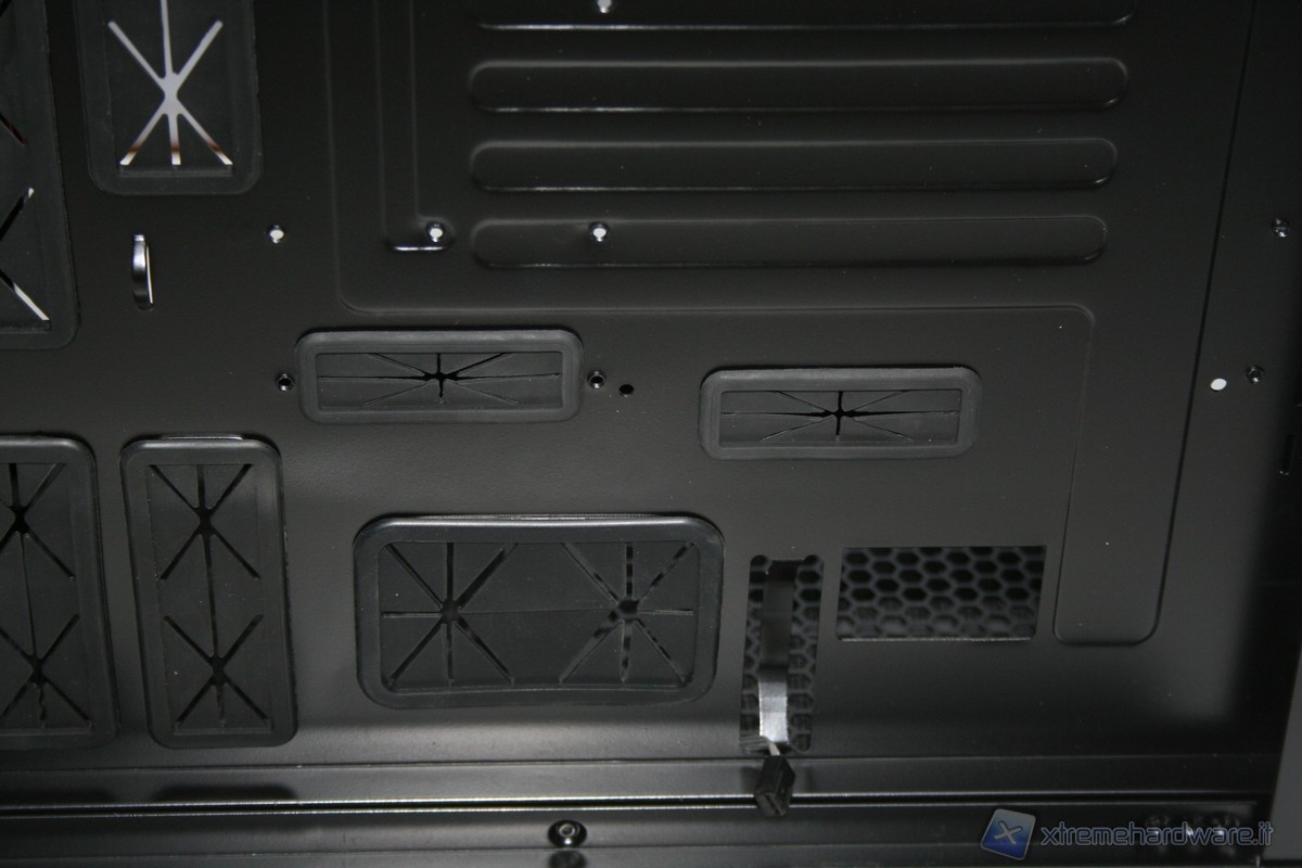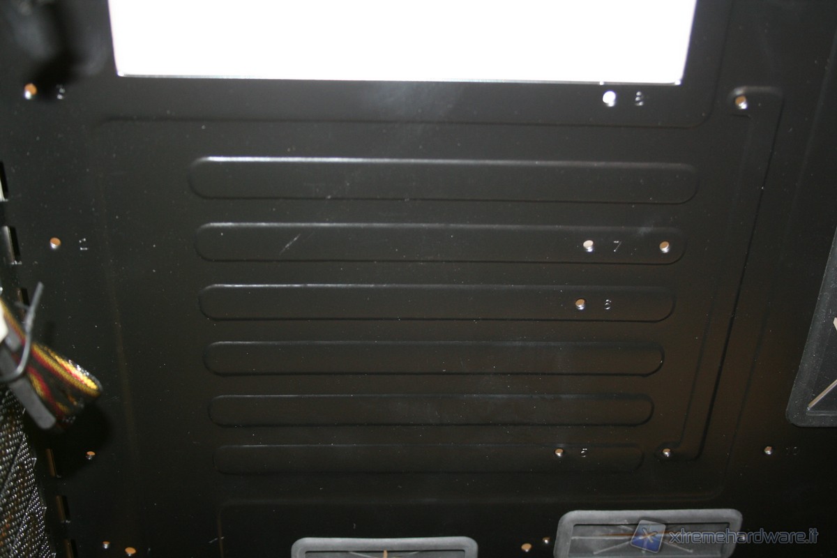 La porzione di ancoraggio della scheda madre è fissa, non è possibile rimuoverla lateralmente, come altri case della concorrenza. Ad ogni modo la grandezza della zona di assemblaggio è davvero molto ampia, come pure il foro in corrispondenza della CPU per facilitare l’installazione di dissipatori aftermarket. La rigidità è molto elevata ed anche qui ci ricorda qualitativamente il Raven3 della SilverStone. Ottima la compatibilità con gli standard e davvero eccellente il sistema di cablaggio, infatti abbiamo numerosi fori con rivestimento in gomma antitaglio. E’ presente inoltre un foro nella parte superiore sinistra, dove sarà possibile far passare il connettore di alimentazione ausiliario della scheda madre da 4/8pin. Posteriormente si hanno numerose aperture dove inserire fascette restringenti, il che permette un livello di pulizia e di ordine molto elevato.