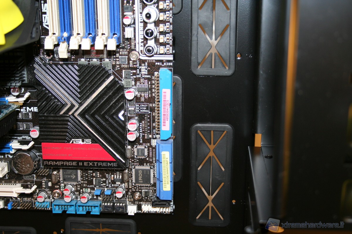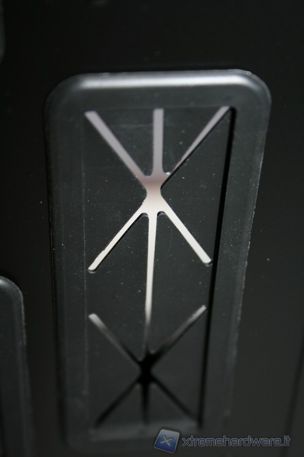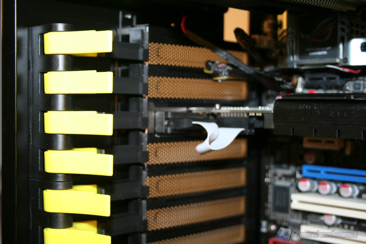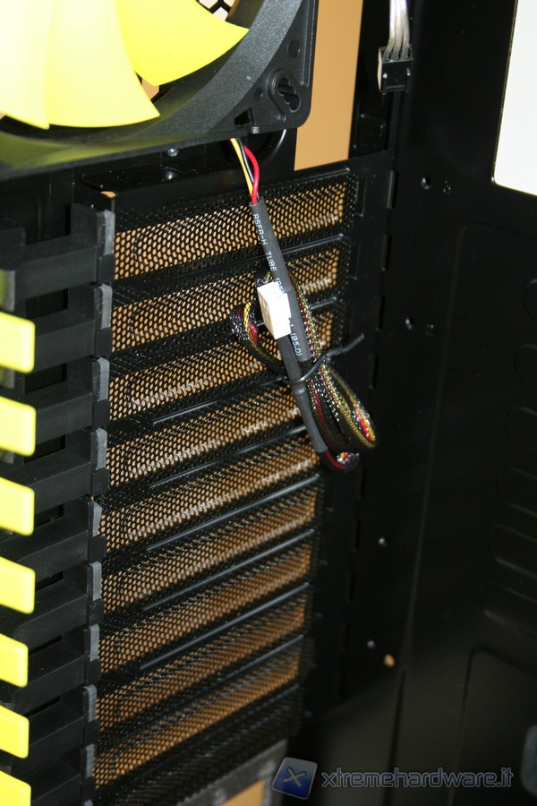 La porzione di ancoraggio della scheda madre è fissa, non è possibile rimuoverla lateralmente, come altri case della concorrenza. Ad ogni modo la grandezza della zona di assemblaggio è davvero molto ampia, come pure il foro in corrispondenza della CPU per facilitare l’installazione di dissipatori aftermarket. La rigidità è molto elevata ed anche qui ci ricorda qualitativamente il Raven3 della SilverStone. Ottima la compatibilità con gli standard e davvero eccellente il sistema di cablaggio, infatti abbiamo numerosi fori con rivestimento in gomma antitaglio. E’ presente inoltre un foro nella parte superiore sinistra, dove sarà possibile far passare il connettore di alimentazione ausiliario della scheda madre da 4/8pin. Posteriormente si hanno numerose aperture dove inserire fascette restringenti, il che permette un livello di pulizia e di ordine molto elevato.