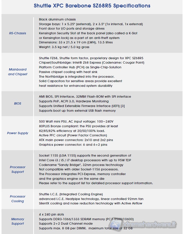 Shuttle XPC Barebone SZ68R5: CPU Intel Sandy Bridge e Chipset Z68 - Shuttle SZ68R5: Caratteristiche Tecniche