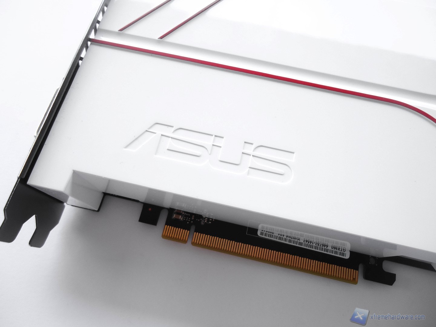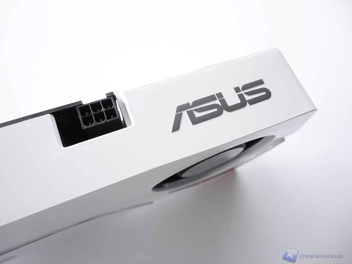 Prendendo in mano la scheda, notiamo le sue generose dimensioni accompagnate anche da un peso abbastanza elevato, circa 800 grammi. Questo è dovuto soprattutto all’enorme dissipatore montato sulla  scheda che si estende anche oltre la lunghezza del PCB. La cover è realizzata in plastica molto economica, infatti scricchiola e si piega perfino se semplicemente prendiamo in mano la VGA tenendola per la cover. All’estremità della cover è alloggiata la singola ventola radiale da 75mm che ha il compito di mandare aria fresca sul radiatore in alluminio e di espellere l’aria calda all’esterno del case. Questa ventola purtroppo non si spegne durante le fasi di Idle o navigazione web, stressandoci con il suo sibilo anche in situazioni dove la scheda video non è messa sotto carico. Infine la cover è abbellita dal logo ASUS impresso in basso rilievo e da alcuni particolari in colorazione rossa.