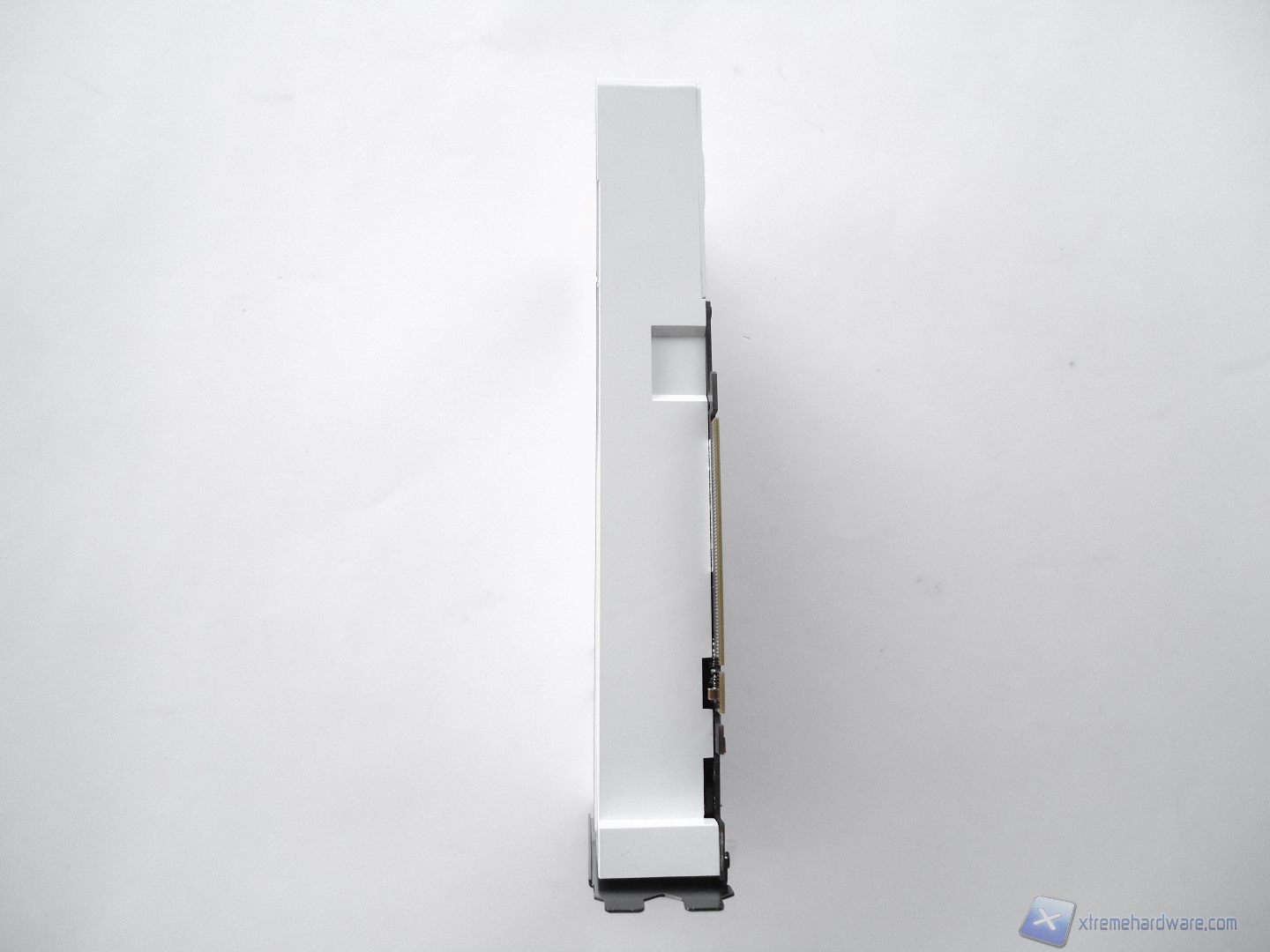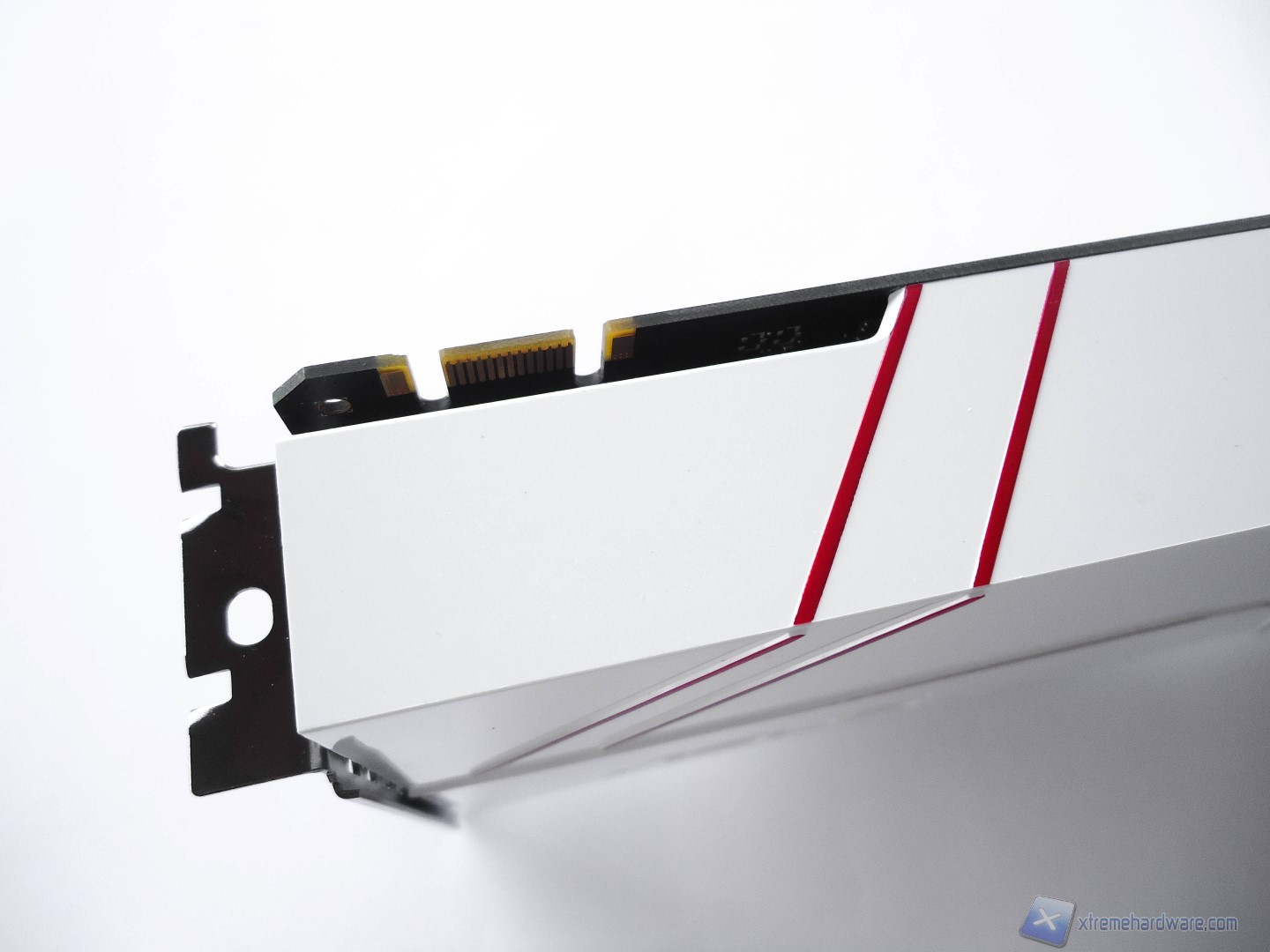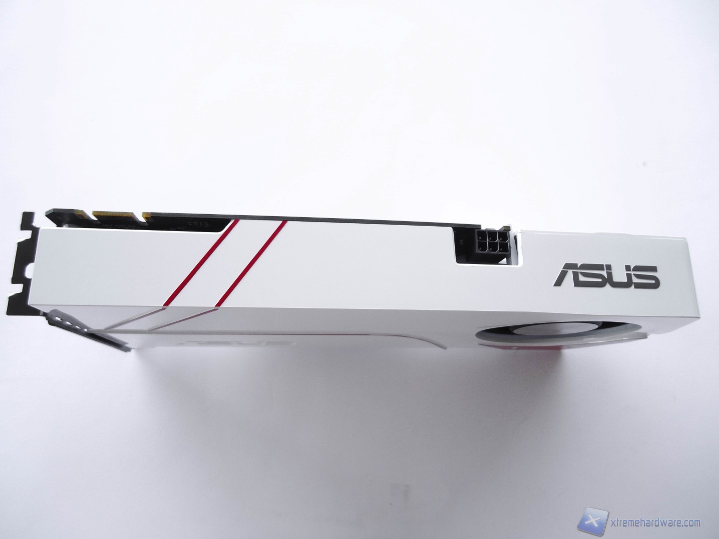 Sulla parte superiore della scheda video troviamo il logo ASUS argentato accompagnato dal singolo connettore di alimentazione da 6-pin, che ci permetterà di aumentare le frequenze di questa scheda video senza alcuna limitazione. Dall’altro lato troviamo invece due strisce rosse oblique utilizzare per abbellire il prodotto e il connettore SLI per mettere al  massimo due schede in parallelo.