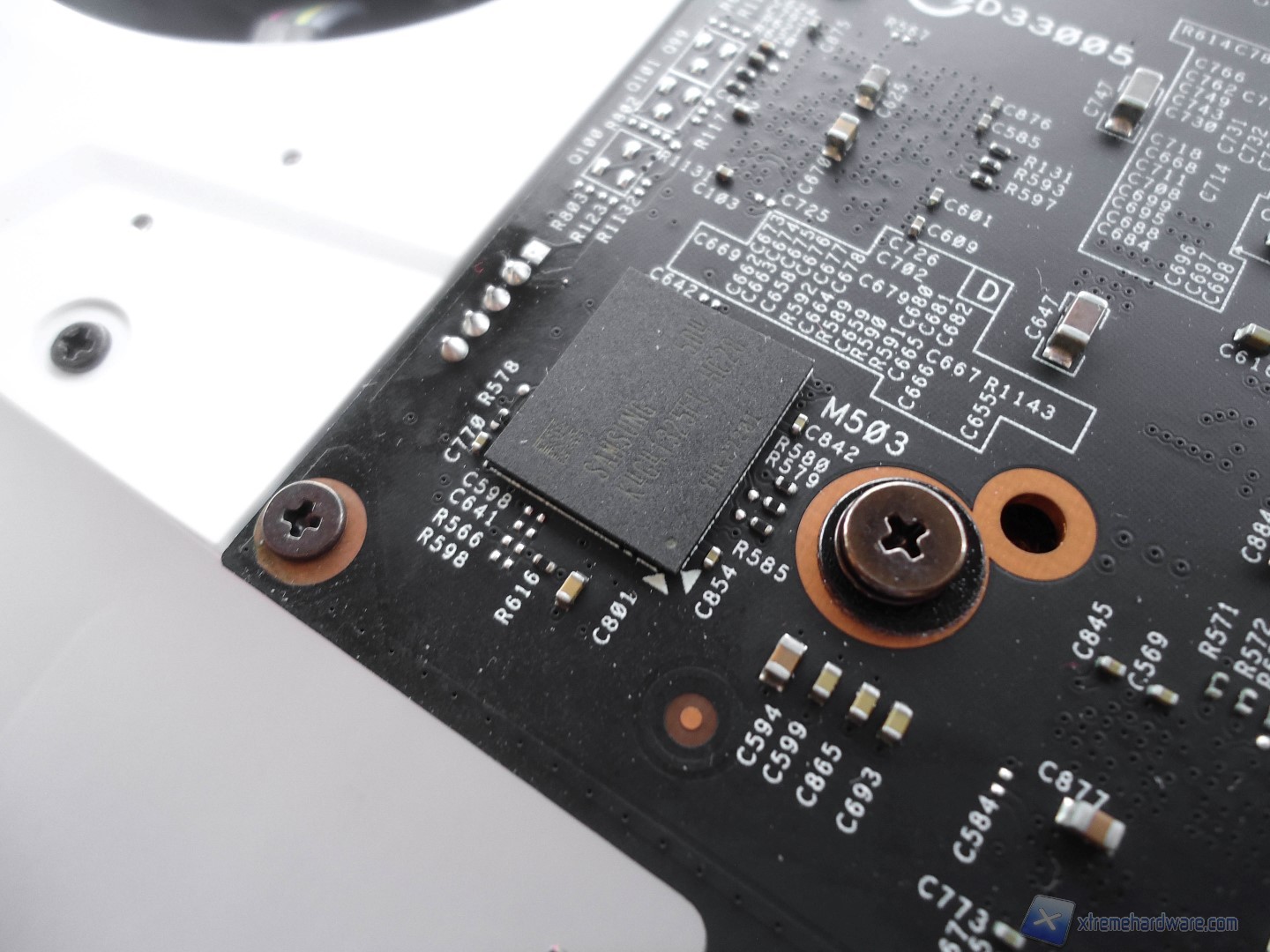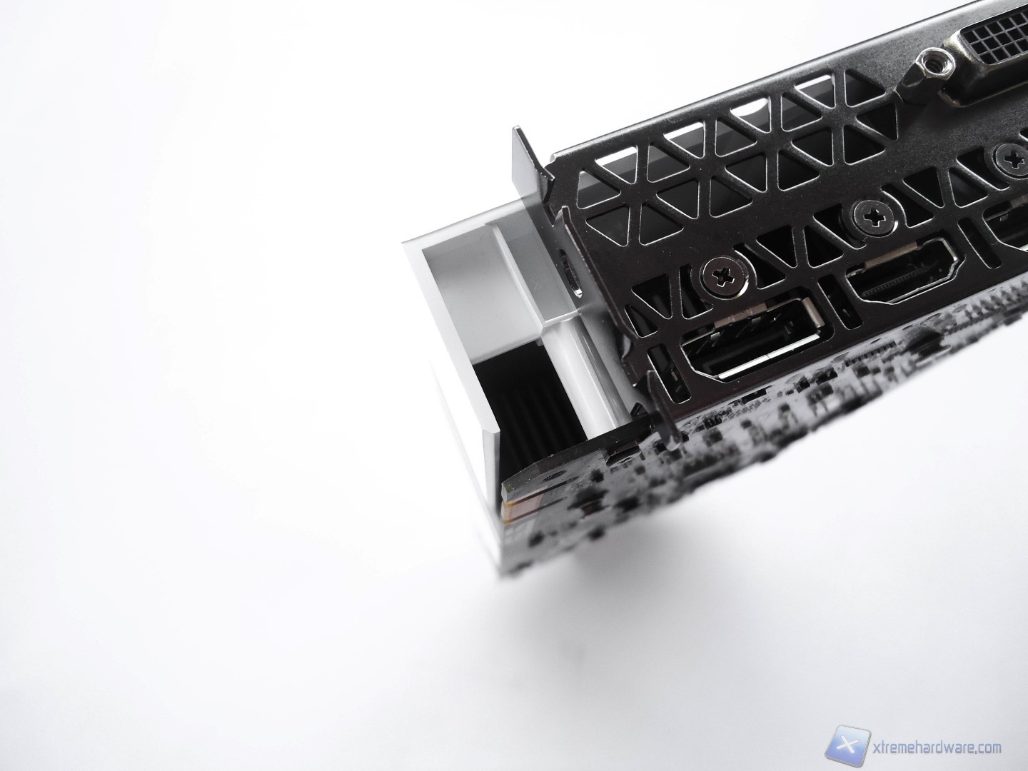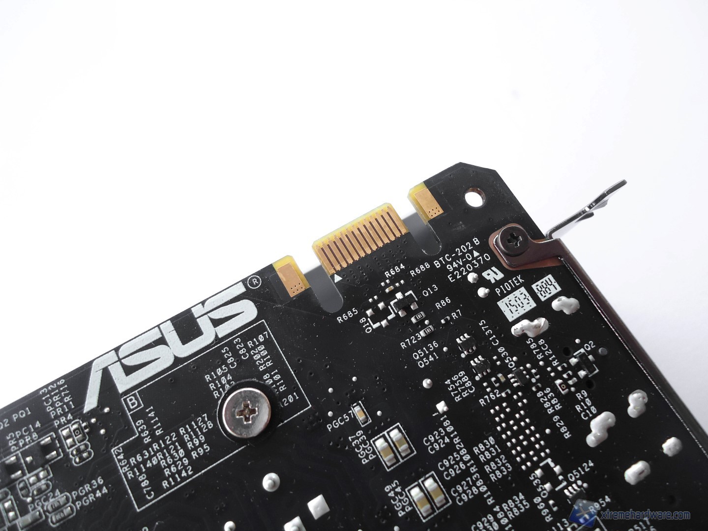 Girando la scheda e mettendo in mostra il posteriore della VGA, notiamo purtroppo che per questa scheda video ASUS non ha incluso alcun backplate, che avrebbe dato di certo un tocco premium. La presenza di un backplate, oltre a conferire un miglioramento estetico, avrebbe potuto dare maggiore rigidità alla scheda e raffreddare i componenti hardware installati sulla parte posteriore del PCB. Da notare la presenza di un bollino di garanzia sulle viti posteriori del dissipatore, quindi non possiamo cambiare pasta termica, cambiare dissipatore o installare un waterblock senza perdere la garanzia. Nella parte posteriore del PCB sono posizionati due chip RAM Samsung riportanti la sigla K4G41325FC-HC28. Da questa inquadratura possiamo vedere meglio l’unico connettore per lo SLI, il connettore PCI-E 3.0 e il connettore di alimentazione girato al contrario rispetto allo standard in modo da poter inserire il pin di alimentazione che altrimenti andrebbe a sbattere contro il dissipatore. Inoltre il connettore di alimentazione è dotato di due LED distinti da una diversa colorazione, bianca quando la scheda è alimentata correttamente e rossa quando non lo è. Infine notiamo che la cover è molto più lunga del PCB e che quest’ultimo è più alto rispetto allo standard. Analizzando con attenzione il PCB, notiamo che è lo stesso della GTX 960 Strix OC, recentemente analizzata. Entrambe adottano un design non reference per la sezione di alimentazione, con 4 fasi per la GPU e 1 per le RAM e componenti Super Alloy Power.